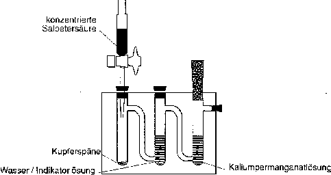 Die Analyse basiert auf der Griess-Reaktion: Ein aromatisches Amin reagiert mit Nitrit unter Bildung einer Diazoniumverbindung, die anschließend mit einer weiteren aromatischen Verbindung zu einem Azofarbstoff kuppelt. Die Reaktionsfolge ist den Schülern aus Kursen über Farbstoffe bekannt. (Vgl. den für Schülerversuche geeigneten und in [9] beschriebenen Nitrit-Nachweis, der die chemischen Abläufe in handelsüblichen Teststreifen recht genau widerspiegelt.) Die mikrobiologische Reduktion von Nitrat zu Nitrit läßt sich zeigen, indem naturfeuchter Waldboden mit KNO3-Lösung versetzt und nach einigen Tagen mit einem Teststäbchen Nitrit nachgewiesen wird [10].